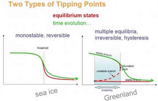 Poi, nel 2011, Rahmstorf propose pubblicamente una riflessione su una ulteriore perdita di ghiaccio nell’Artico e su “Due tipi di punti di svolta“. (L’IPCC definisce il punto di svolta come “la soglia che una volta superata porta ad un brusco ed irreversibile cambiamento”). Per spiegare la sua teoria, Rahmstorf illustrò un grafico concettuale riprodotto nella Fig. 2 nel quale, inizialmente si ha un calo crescente del livello minimo del ghiaccio marino Artico che raggiunge un punto di flessione dopo il quale il calo tende a rallentare, ma che tuttavia poco più tardi porta a una situazione prossima alla completa assenza di ghiaccio.