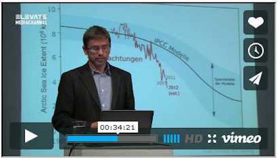 Poi, nel 2012, nel corso di un’altra conferenza, ecco a sorpresa che il ghiaccio era diminuito ancora di più rispetto al 2008 e lui allora si soffermò sulla cosa (si veda la linea rossa nella Fig. 3). Il declino sembrava essere rapido e inarrestabile. Sicuramente, il punto di flessione nei modelli (linea nera) era stato ampiamente superato. Rahmstorf ancora una volta si assicurò che il pubblico assimilasse il suo messaggio enfatizzandolo con affermazioni del tipo: “[tradotto] Il mese scorso, la copertura del ghiaccio [artico] è all’incirca stata solamente la metà delle dimensioni di quella del 1979″ e “lo sviluppo attuale mostra che la fusione del ghiaccio è molto più veloce rispetto alle previsioni dei modelli” e “purtroppo il problema [della fusione del ghiaccio artico] in passato è stato fortemente sottovalutato; e il ghiaccio continua ad assottigliarsi.” L’intera conferenza è disponibile all’indirizzo https://vimeo.com/56007848.