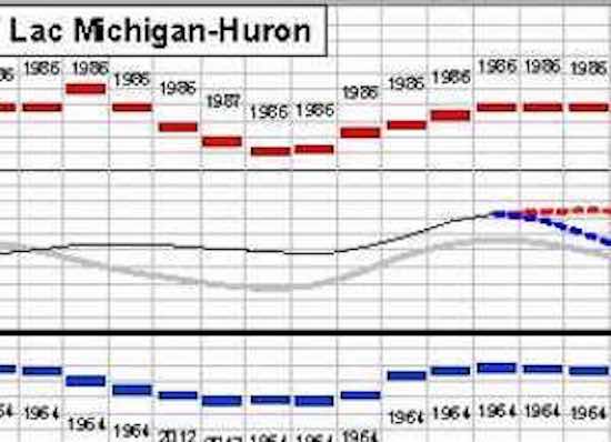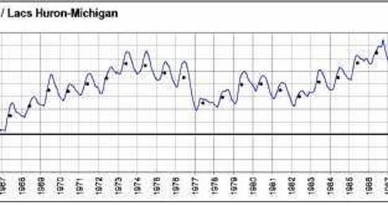 A cominciare dal 1980 o giù di lì, il livello dei Laghi Huron e Michigan (LHM, che è identico a causa dell’ampio canale allo Stretto di Mackinac), andò divenendo sempre più alto per raggiungere un nuovo record di 150 anni nel 1986 (Fig. 5). Molti proprietari di immobili sulle rive del lago cominciarono allora a temere il superamento di un “Punto di Svolta” e chiesero a gran voce al / i governo (i) di “fare qualcosa”.
