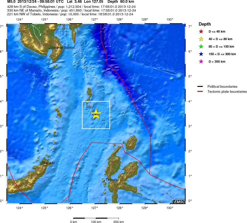 | Distances | 1089 km N of Dili, East Timor / pop: 150,000 / local time: 17:38:09.0 2013-06-27 261 km E of Manado, Indonesia / pop: 451,893 / local time: 16:38:09.0 2013-06-27 47 km NW of Ternate / pop: 101,731 / local time: 17:38:00.0 2013-06-27 |