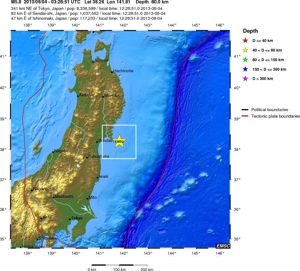 2013-08-04 03:28:51.0 38.26 N 141.81 E 60 5.8 NEAR EAST COAST OF HONSHU, JAPAN
