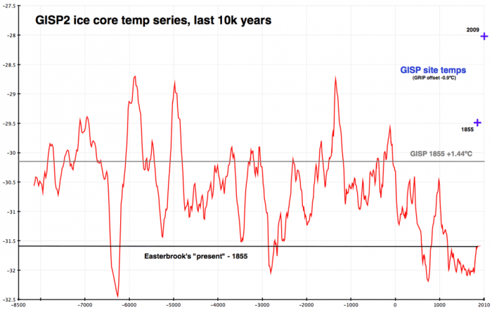 Guardando il grafico in questo formato, l’unica cosa che possiamo capire è che “oggi”, la temperatura media della Groenlandia sembra essere decisamente inferiore di quasi 1°C rispetto a quella degli ultimi 8-9000 anni.