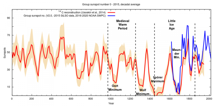 Tra l’altro, in questo grafico, possiamo vedere che la linea delle macchie solari è leggermente diversa dalla linea della ricostruzione mediante dati proxy (in questo caso l’isotopo 14C).