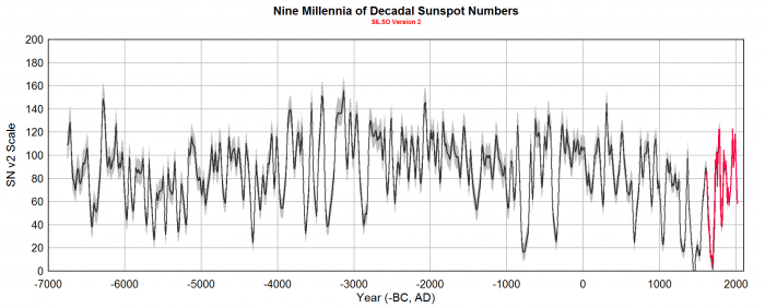 L’attività solare viene monitorata, registrata e studiata quotidianamente, da circa 400 anni. Nel corso di questo lasso di tempo, di scoperte ne sono state fatte tante. Compresa la relazione tra alcuni isotopi particolarmente “sensibili” all’attività solare, e l’attività solare stessa. Studiando la concentrazione di tali isotopi nel corso del tempo, tramite analisi di carote di ghiaccio e/o stratificazione dei sedimenti lacustri, terrestri e oceanici, è stato possibile ricostruire l’andamento dell’attività solare, nello specifico del numero MEDIO delle macchie solari, nel corso degli ultimi 9000 anni.