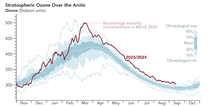 Le concentrazioni di ozono nell’Artico hanno raggiunto una media mensile record nel marzo 2024. A causa dei sistemi meteorologici su larga scala che hanno disturbato l’atmosfera superiore durante l’inverno 2023-2024, una quantità maggiore di ozono si è spostata e ha persistito nella stratosfera sopra l’Artico rispetto a qualsiasi altro momento nella registrazione satellitare.