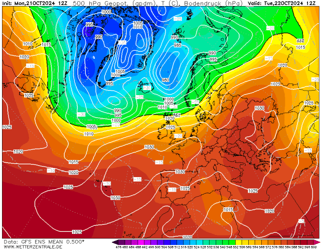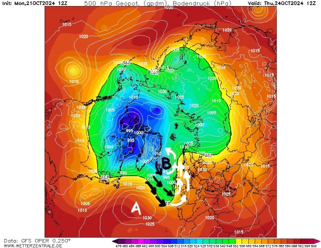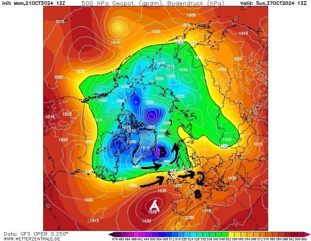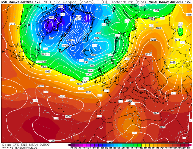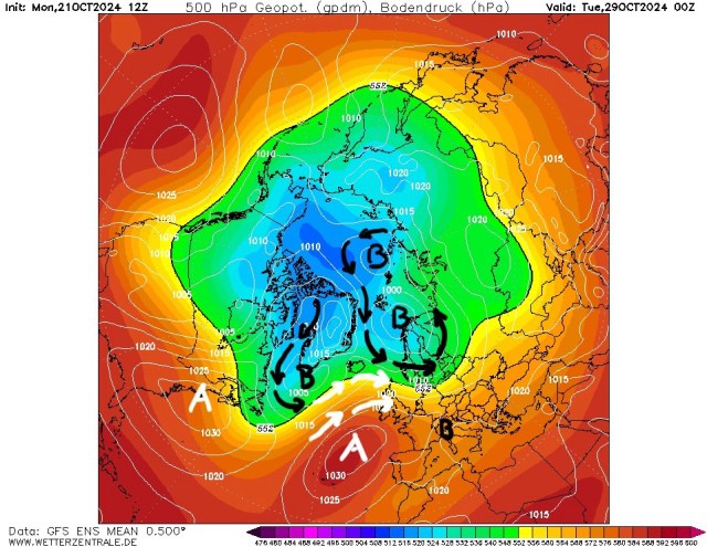 Sono diversi run che il VP viene visto in indebolimento. In questa media relativa alle 180 ore del modello americano si vede una trilobazione del VP con una parte dislocata sulla Scandinavia ed una sul Canada, con l’anticiclone delle Azzorre pronto a chiudere il flusso atlantico e determinare un’irruzione artica sull’Europa proprio per la fine del mese. Anche oggi dunque sottolineiamo questa possibilità di cambio deciso di pattern verso condizioni tipicamente invernali già per la fine di ottobre, come, tra l’altro, indicano anche le medie delle anomalie termiche previste per il 31 di ottobre con una importante anomalia negativa proprio sul Mediterraneo centrale…arriva dunque l’inverno per Ognissanti? Possibile.