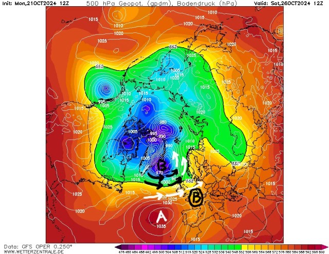 Evidente lo schema generale che porterà probabilmente ad un nuova fase di maltempo sul centro/nord. Irruzione di aria fredda sull’Iberia, a causa di una nuova ondulazione del jet stream; ma un repentino rinforzo del VP farà ripartire con vigore il getto atlantico tagliando l’alimentazione fredda alla saccatura che andrà in cutoff. L’alta pressione delle Azzorre spingerà la bassa pressione sull’Italia centro-settentrionale che avrà probabilmente un nuovo weekend caratterizzato dal maltempo, probabilmente meno pesante di quello precedente, ma comunque pericoloso per le condizioni di particolare fragilità del nostro territorio dopo 40 giorni piogge eccezionali. Probabilmente questa sarà l’ultima evoluzione tipicamente autunnale della stagione. Infatti un nuovo importante indebolimento del VP potrebbe portare l’inverno a determinare i suoi primi grandi movimenti verso le basse latitudini europee.
