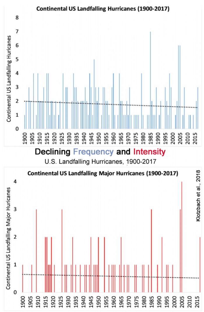 Un altro studio scientifico appena pubblicato da Klotzbach et al., 2018 ci dicono che dal 1900 né gli Stati Uniti continentali hanno aumentato la frequenza degli uragani né l’intensità hanno mostrato tendenze significative (compresa la stagione devastante del 2017).