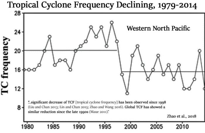 Infine una quarta pubblicazione scientifica di Zhao et al., 2018 hanno esaminato la relazione tra l’aumento dell’attività dei cicloni tropicali e l’aumento delle temperature superficiali del mare. Tre precedenti studi di Liu e Chan 2013, Lin e Chan 2015 e Zhao e Wang 2016 hanno mostrato che dal 1998 si è verificata una significativa diminuzione della frequenza dei cicloni tropicali nel bacino del Pacifico Nord Occidentale.