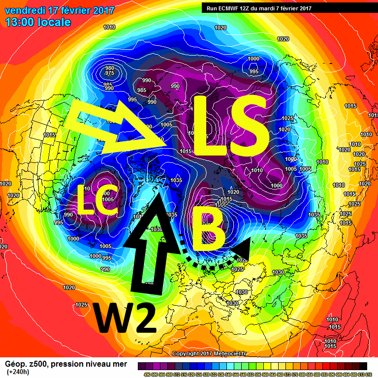 A seguire, sembra che i promotori anticiclonici cerchino a tutti i costi di collocarsi nelle regioni italiane, nonostante un Vortice Polare che anche in troposfera inizi a evidenziare chiari segnali di debolezza, anche nel modello europeo, finora così sfavorevole (fig.5).