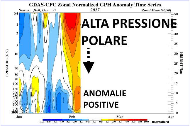 Davvero curioso quanto sta accadendo in questo Febbraio a scala emisferica ma in particolare nei suoi risvolti nel settore europeo mediterraneo. Il Vortice Polare appare debole in tutta la colonna barica come evidenziato dalla cross section delle anomalie di geopotenziale nlle regioni polari (fig.6).