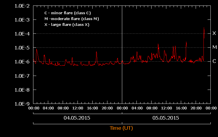 Il Campo Geomagnetico solare nella giornata di oggi 05 maggio 2015 è risultato in stato “QUIET” mentre gli X Ray sono risultati in stato “M CLASS FLARE