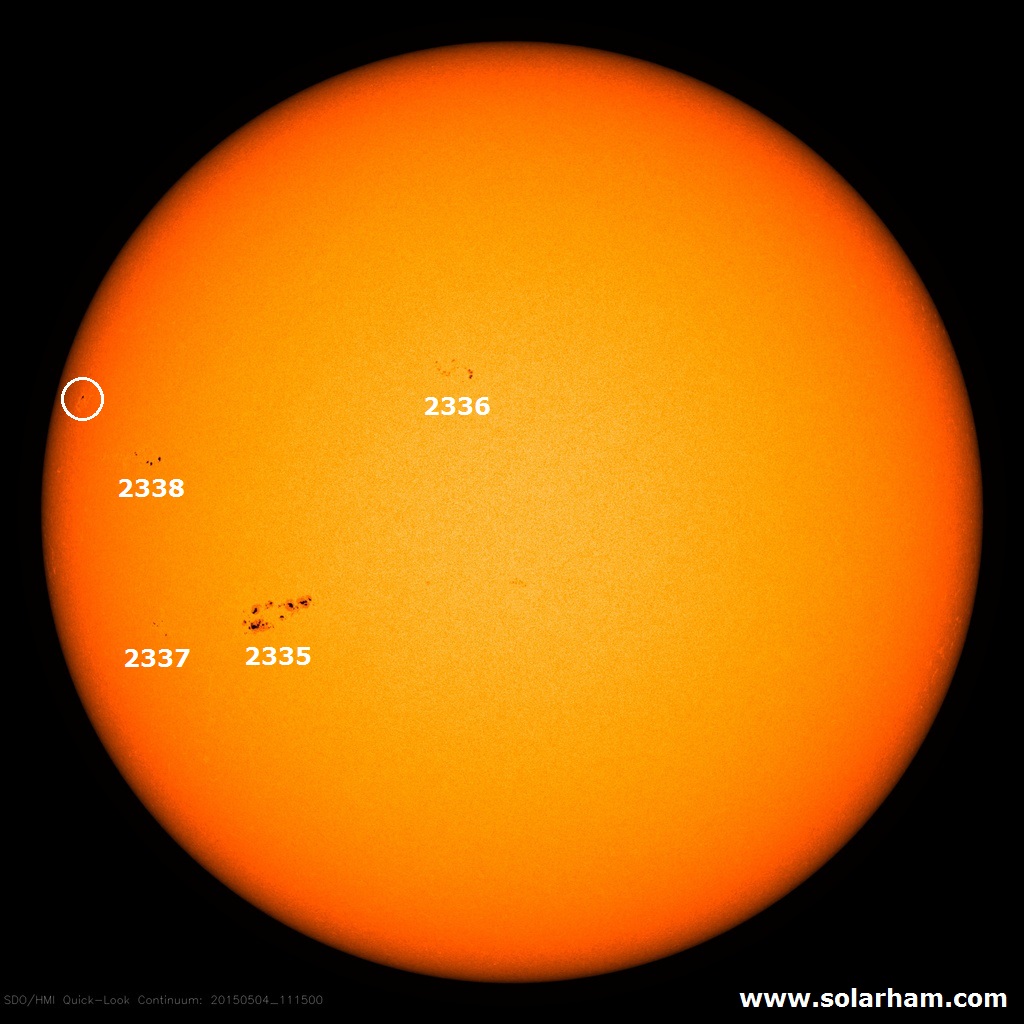 Alle ore 18.00 UTC di oggi, il disco solare visibile da terra presentava 4 regioni attive (in risoluzione 2K da immagini SDO/HMI) e una in formazione (cerchiata di bianco):