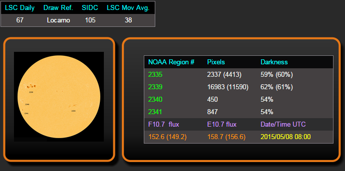 Il conteggio delle macchie solari del Layman’s (gestito da Geoff Sharp), nella giornata del 08 maggio alle ore 08:00 (ultimo aggiornamento disponibile) è risultato di 67 SN che porta la media mensile a 38 SN