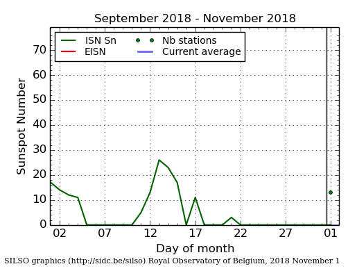 Il 2018 ha un conteggio parziale di 188 giorni spotless 61% (dati ufficiosi) conteggio SILSO/SIDC, Belgio.