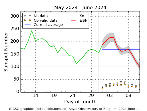 Record macchie solari mensile – Ente SILSO/SIDC Ciclo 25: SSN 171.7 (Maggio 2024)