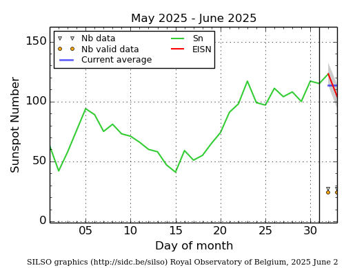 Il 2025 ha un conteggio parziale di 0 giorni su 152 (0%) spotless days (dati ufficiosi) conteggio SILSO/SIDC, Belgio.