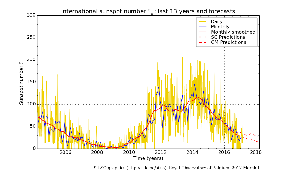L’andamento dell’attività solare negli ultimi 13 anni e forecast (linee tratteggiate). Grafico del centro di conteggio SILSO