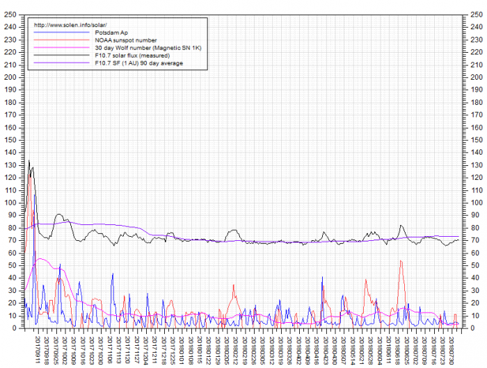 Nel grafico, l’andamento del SC 24 da luglio 2017 al periodo attuale: la linea di colore nero fa riferimento al flusso solare, quella di colore rosso al conteggio delle macchie solari, mentre quella di colore blu all’Indice AP.
