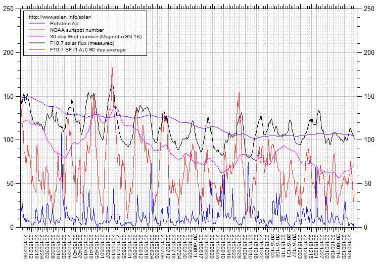 Il mese di Gennaio 2016 ha totalizzato 0 giorni Spotless / giorni Spotless emisfero nord: 4 / giorni Spotless emisfero sud: 22