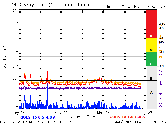 Previsioni per le prossime 72 ore: L’attività solare è destinata a restare molto bassa nei prossimi 3 giorni (27–29 maggio) con possibili flare di classe C.