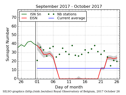 Il conteggio delle macchie solari giornaliere (conteggio SILSO) del 26 ottobre è risultato di 24 – (24)