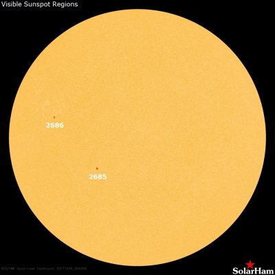 Alle ore 08.00 UTC, il disco solare visibile presentava 2 regioni attive (in risoluzione 2K dalle immagini SDO/HMI Continuum):