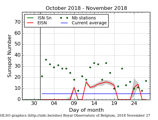 Il 2018 ha un conteggio parziale di 203 giorni spotless 61% (dati ufficiosi) conteggio SILSO/SIDC, Belgio.