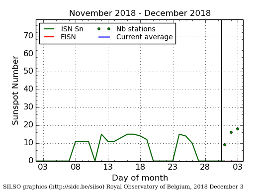 Il 2018 ha un conteggio parziale di 209 giorni spotless 62% (dati ufficiosi) conteggio SILSO/SIDC, Belgio.