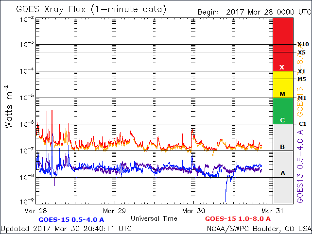 Previsioni per le prossime 72 ore: L’attività solare è destinata a restare molto bassa con la possibilità di brillamenti di classe C e occasionali possibili di classe M (R1-R2, Minore-Moderato) nei prossimi tre giorni (31 marzo 02 aprile).