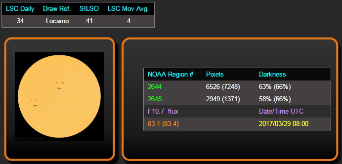 Il conteggio delle macchie solari con il metodo del Layman’s Sunspot Count (gestito da Geoff Sharp), nella giornata del 29 marzo alle ore 08:00 UTC (ultimo aggiornamento disponibile) è risultato con un conteggio di 34 macchie e con media mensile a 4 ssn.