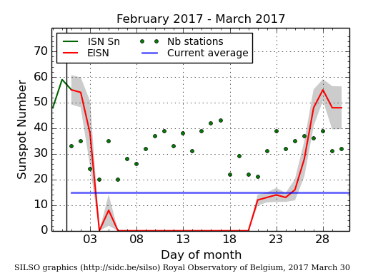 Otto giorni spotless contati nel mese di gennaio, sedici a marzo, di cui gli ultimi quindici consecutivi. Venticinque giorni spotless complessivi nel 2017 per il centro di conteggio del SIDC, Belgio.
