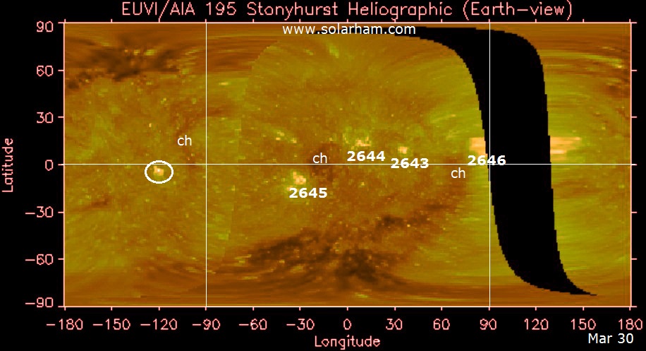 Attività odierna: Attività solare che nella giornata del 30 marzo ha mantenuto livelli molto bassi. La Regione 2644 (N12W16, Eao/beta) ha mostrato un lieve decadimento. la Regione 2645 (S10E23, Dsi/beta) è cresciuta leggermente, mostrando un certo consolidamento.