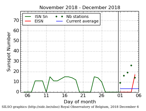 Il 2018 ha un conteggio parziale di 210 giorni spotless 62% (dati ufficiosi) conteggio SILSO/SIDC, Belgio.