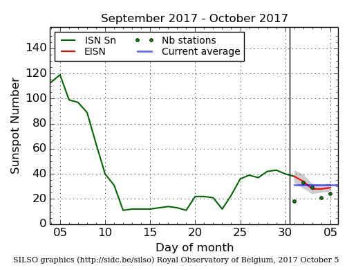Il conteggio delle macchie solari giornaliere (conteggio SILSO) del 5 ottobre è risultato di 29 – (28)