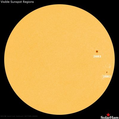 Attività ultime 24h: Attività solare che nella giornata del 5 Ottobre è rimasta a livelli molto bassi. Le Regioni 2682 (S10W67, Hsx/alpha) e 2683 (N13W51, Cko/beta) sono rimaste entrambi stabili e per lo più inattive. Non sono state osservate CMEs dirette verso la Terra dalle immagini disponibili al coronografo.