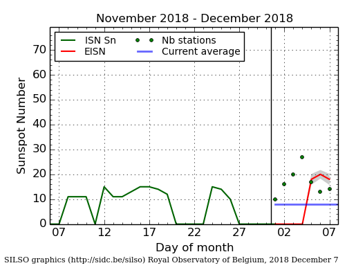 Il conteggio delle macchie solari giornaliere (conteggio SILSO/SIDC) del 7 dicembre è risultato di 18.0 – (20.0)