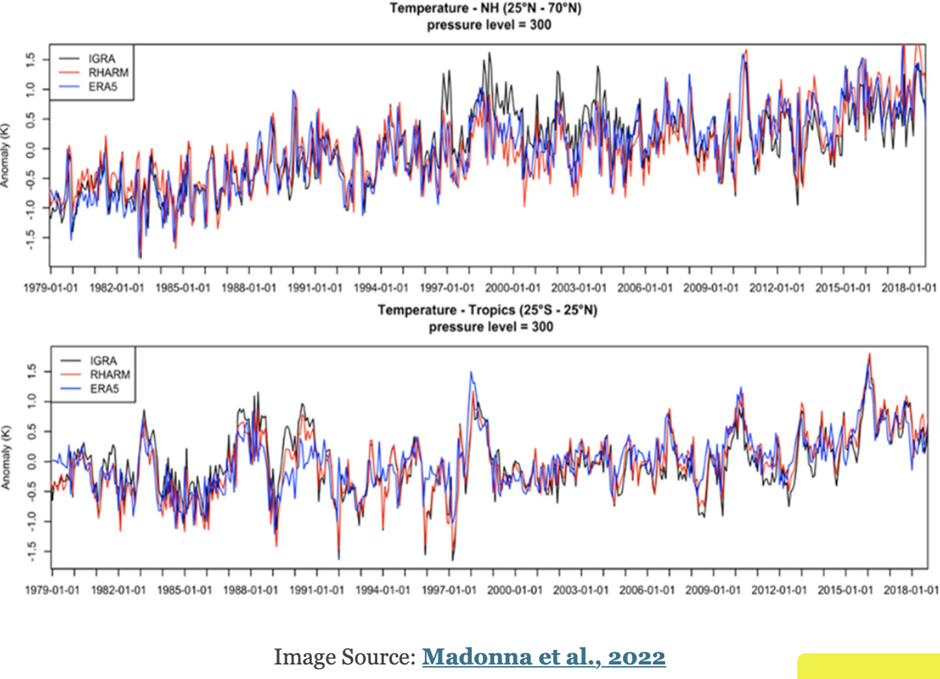 Le letture in tutta la troposfera, la bassa atmosfera terrestre che si estende fino a 15 km di altitudine, sono disponibili da molti anni. I ricercatori sono stati in grado di utilizzare i metadati di misurazione per migliorare la coerenza dei record ottenuti da quasi 700 località globali, registrando due volte al giorno dal 1978, a 16 livelli di pressione. Il rallentamento dal 1998 osservato nei dati nella misurazione dai pallone sonda è confermato da accurati dati satellitari, che mostrano anche una pausa attuale di circa 91 mesi. Una pausa precedente dal 1998 al 2012 è stata in gran parte cancellata da tutti i principali set di dati sulla temperatura superficiale.