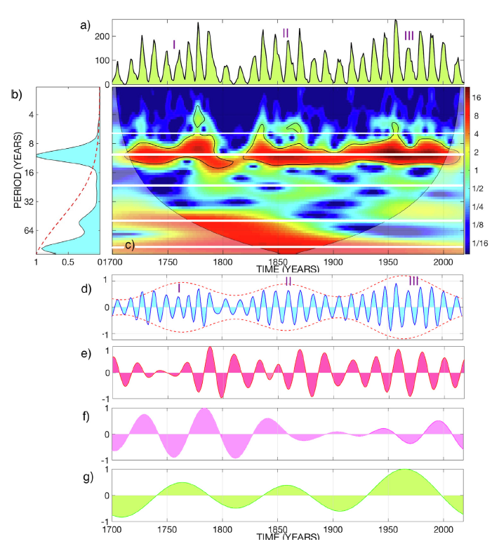 Fig. 1. Risultati dell’analisi spettrale wavelet tempo-frequenza. (a) Record annuali delle serie temporali delle macchie solari dal 1700 al 2019. (b) Il periodo wavelet medio globale (pannello di sinistra). (c) La densità spettrale di potenza wavelet di Morlet (MWPSD) in unità arbitrarie che adottano le scale di colore rosso-verde-blu. (d) Variazioni periodiche del ciclo solare di 11 anni (es. il ciclo di Schwabe). (e) Variazioni periodiche del ciclo solare di 22 anni (ciclo di Hale). (f) Le variazioni periodiche del ciclo solare di 60 anni (il ciclo Yoshimura-Gleissberg). (g) Variazioni periodiche del ciclo solare di 120 anni. I numeri romani ”I”, ”II” e ”III” nei pannelli (a) e (d) indicano il ciclo di Wolf discusso nel testo principale. Immagine: progressi nella ricerca spaziale.