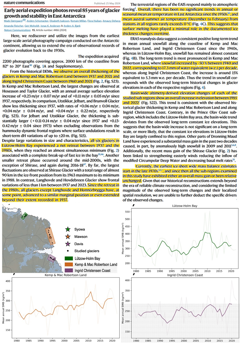 È interessante notare che le foto mostrano che tutti questi ghiacciai dell’Antartide orientale sono rimasti stabili, ispessiti, hanno guadagnato massa e/o sono aumentati di altitudine negli ultimi 85 anni, con gran parte della crescita e dei guadagni di massa che si sono verificati dal 1985.
