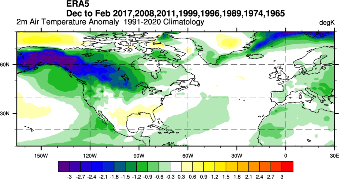 Questo può essere visto nella mappa delle anomalie di temperatura di 2 m qui sotto, che riassume tutti gli inverni finora con una costellazione simile a quella prevista per il 2024-25: