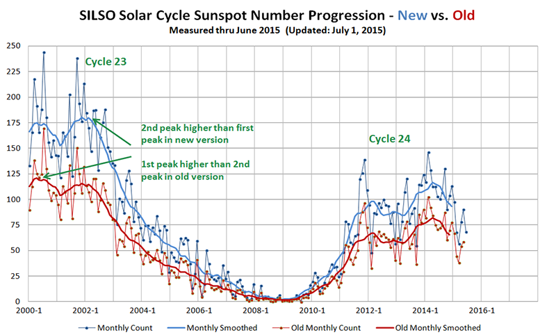 Nel grafico i due cicli solari 23 e 24 del vecchio metodo di conteggio (colore rosso) e del nuovo metodo di conteggio (colore blu).