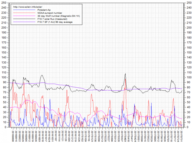 Nel grafico, l’andamento del SC 24 da agosto 2016 al periodo attuale: la linea di colore nero fa riferimento al flusso solare, quella di colore rosso al conteggio delle macchie solari, mentre quella di colore blu all’Indice AP.