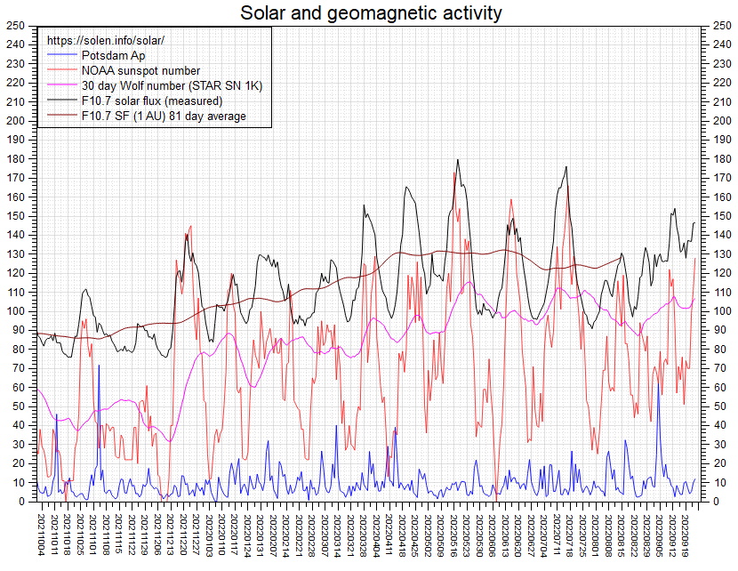Nel grafico, l’andamento del SC24 da Settembre 2021 al periodo attuale: la linea di colore nero fa riferimento al flusso solare, quella di colore rosso al conteggio delle macchie solari, mentre quella di colore blu all’Indice AP.