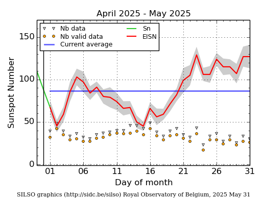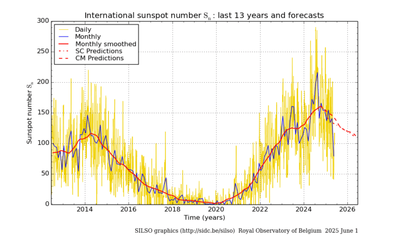 Il conteggio definitivo delle macchie solari del mese di Maggio 2025 (dati SILSO/SIDC).