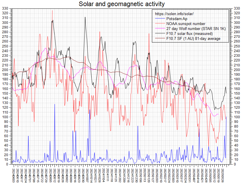 Nel grafico, l’andamento del SC25 da Giugno 2024 al periodo attuale: la linea di colore nero fa riferimento al flusso solare, quella di colore rosso al conteggio delle macchie solari, mentre quella di colore blu all’Indice AP.