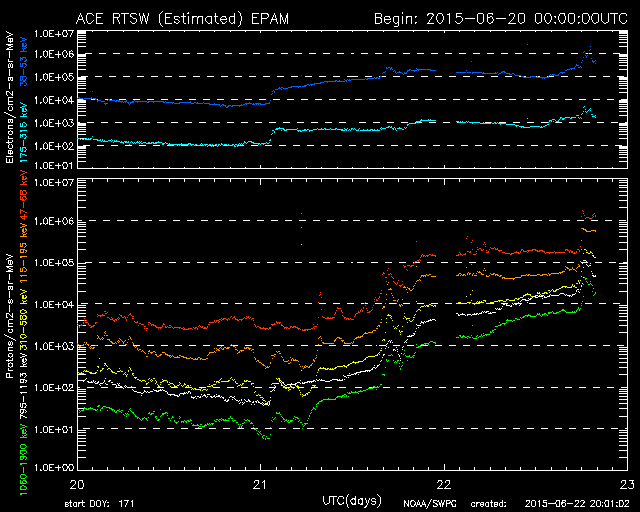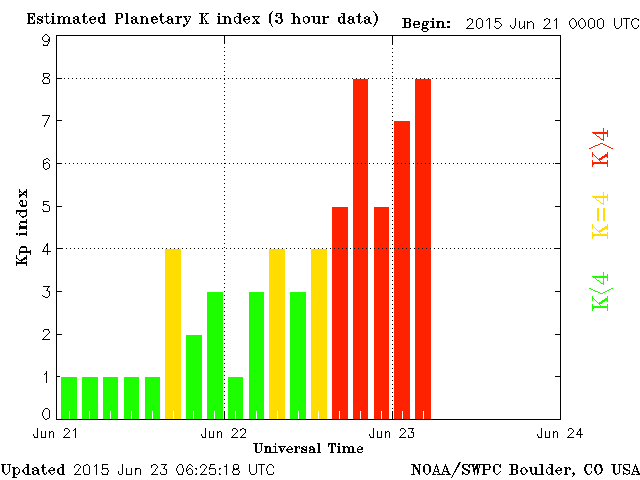 Le tre espulsioni di massa coronale (CME) prodotte il 18 giugno, 19 e 21 giugno sono impattate sul nostro pianeta e il loro effetto combinato ha causato una forte tempesta geomagnetica classificata G4 tra ieri 22 giugno e oggi 23 giugno 2015.