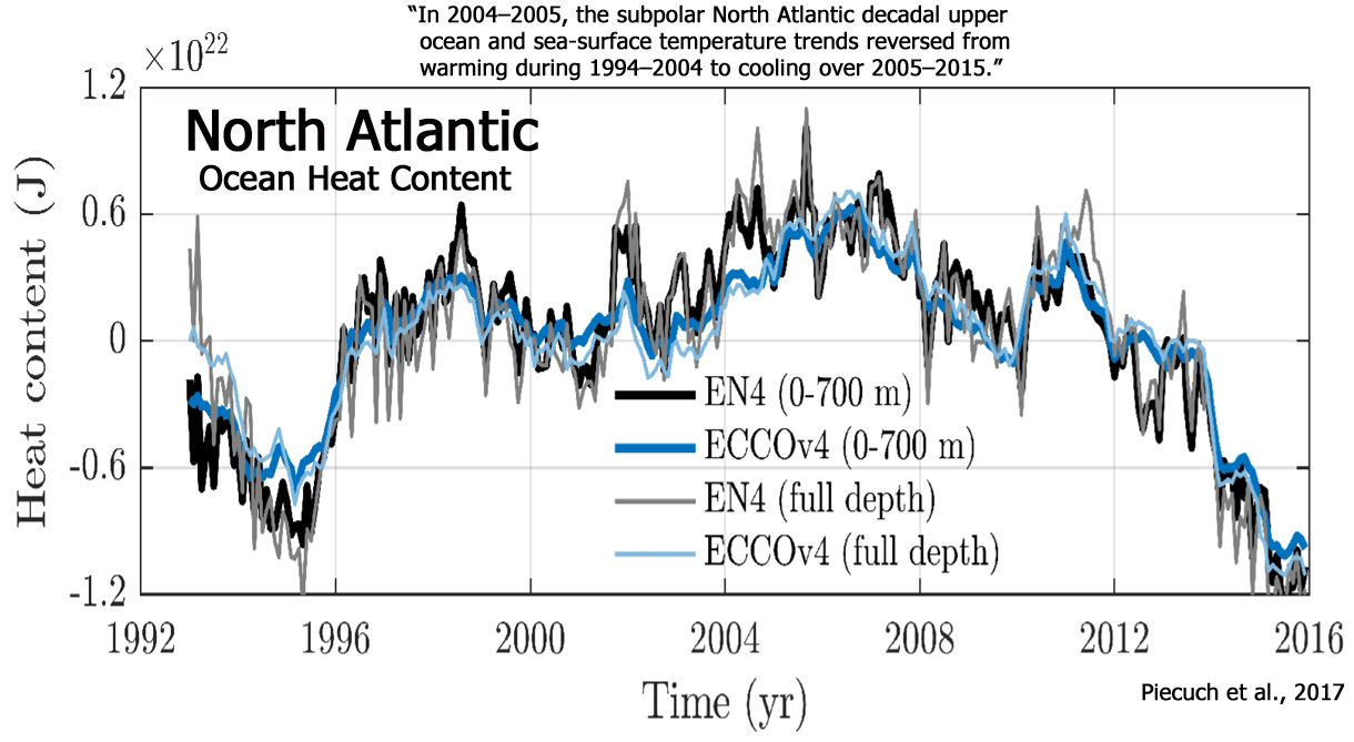 Da una prospettiva a più lungo termine, si noti quanto siano fredde le temperature della superficie del mare subpolare del Nord Atlantico oggi. Le temperature sono crollate dal secolo scorso.